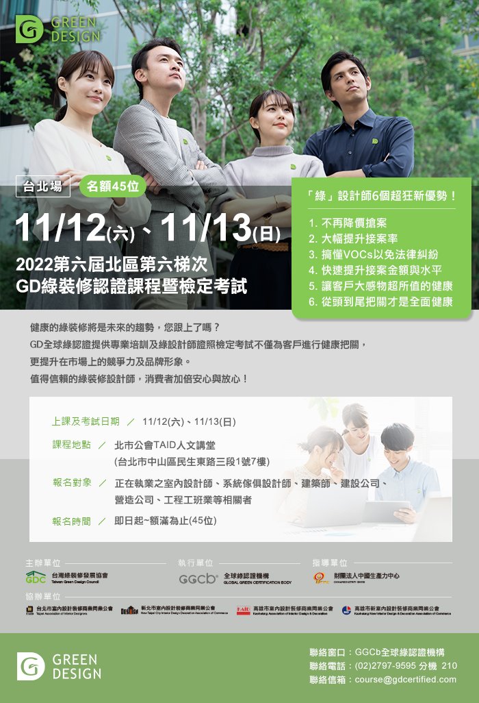 全球綠認證機構│GD綠裝修認證課程暨檢定考試 11月台北場