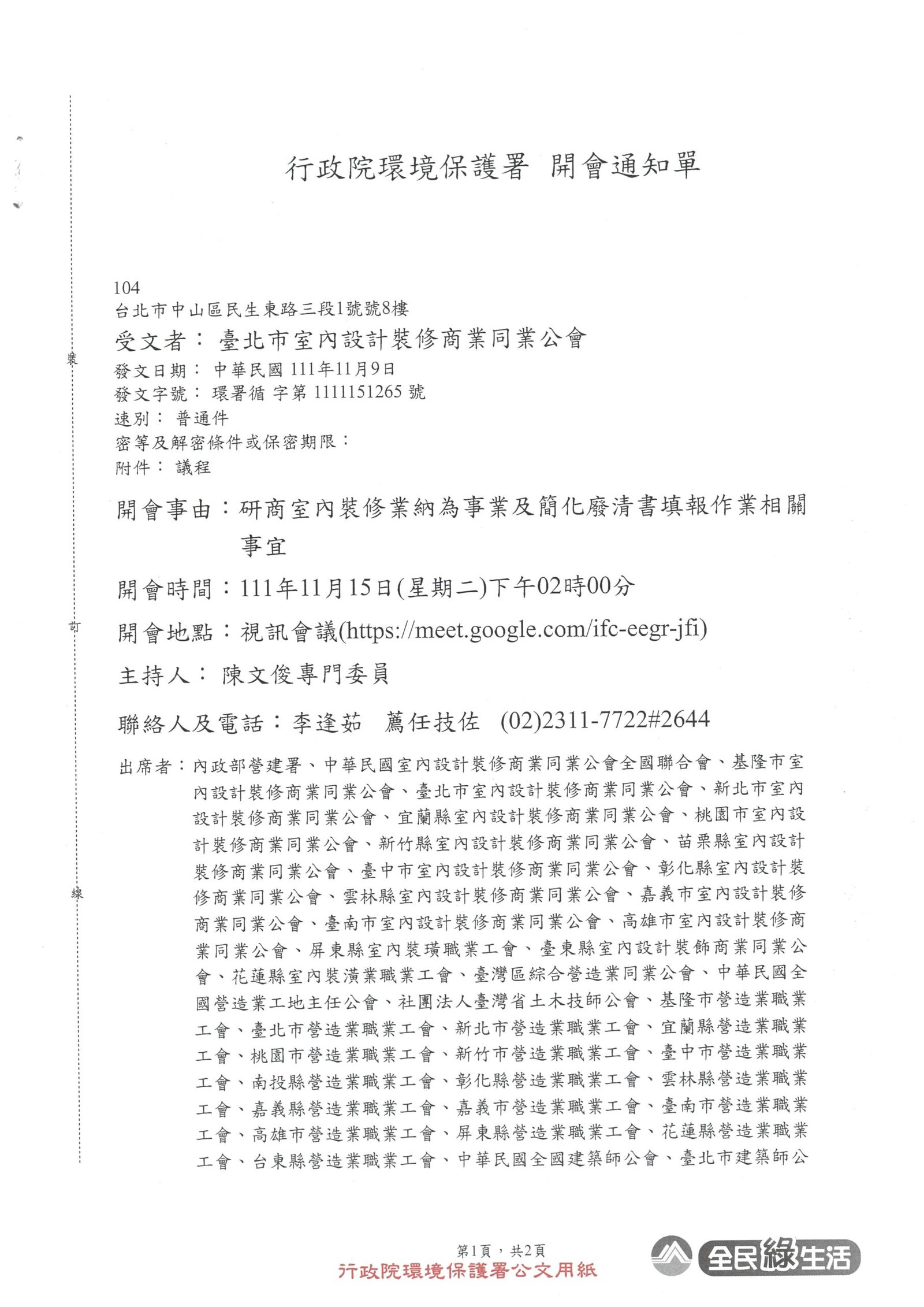 行政院環境保護署|開會通知單(視訊會議)