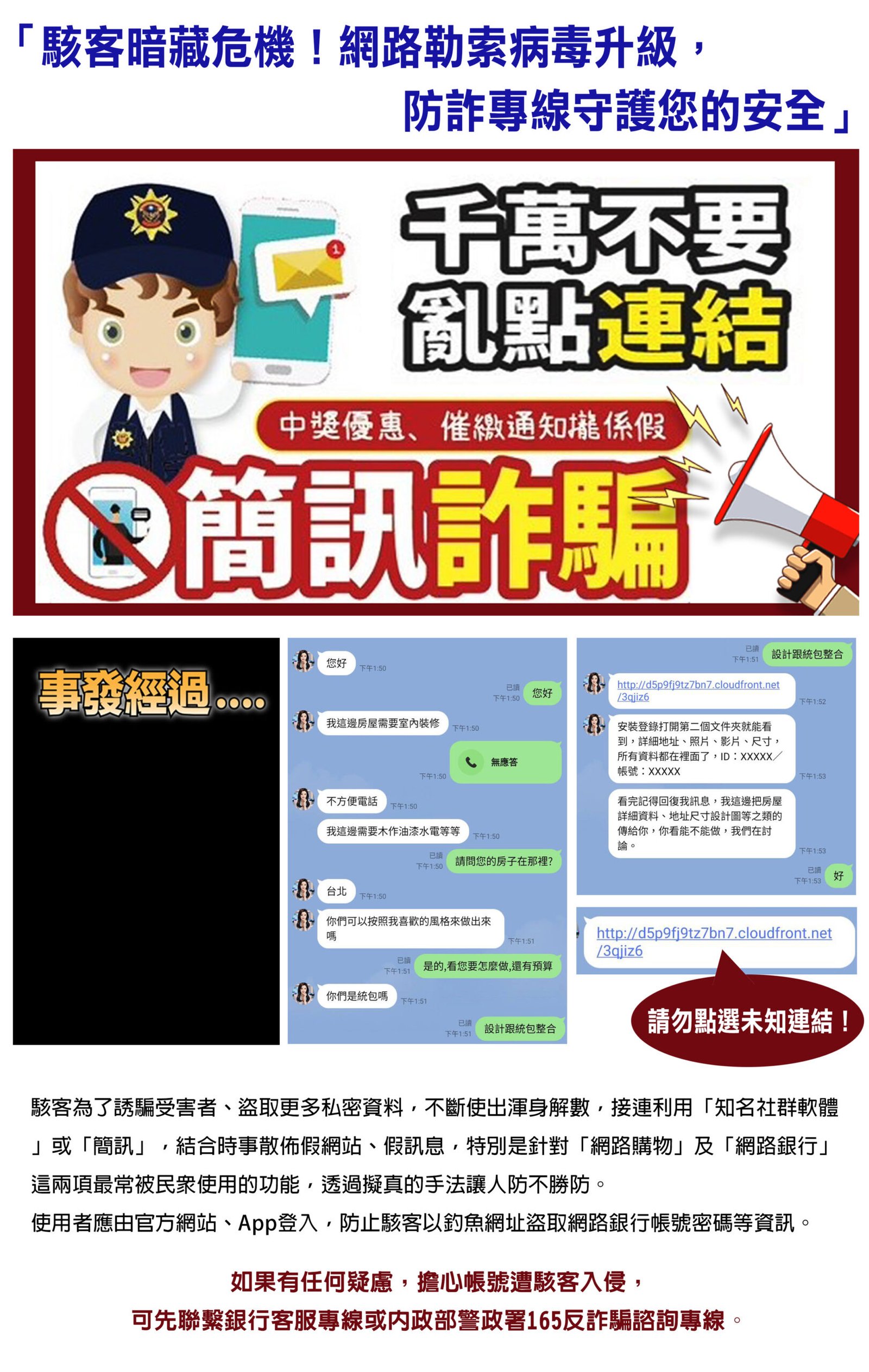 📣近期有室內設計師被詐騙,請務必提高警覺: 1. 詐騙者會透過 LINE 突然加你好友,假稱詢問室內裝修接案。 2. 提供模糊照片,稱檔案過大,要求你下載軟體或點選雲端連結。 3. 常用誘導工具如 Facetune 或 Facetime,實際上可能是釣魚工具。 ⚠️ 切記: 🚫不要點選未知連結! 🚫不要下載來路不明的軟體! 🚫提高警覺,保護個人資料與財產安全! 遇到類似情況,建議立刻刪除訊息並封鎖,必要時通報內政部警政署165全民防騙網。