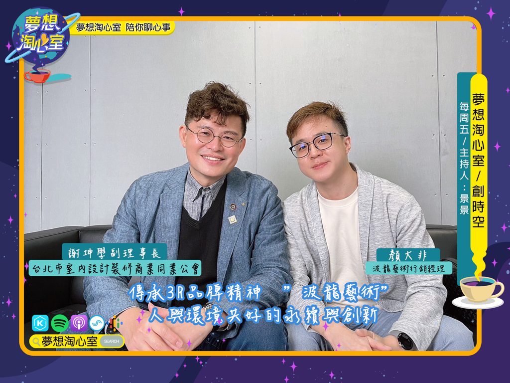 夢想淘心室3月27日【創時空】邀請TAID台北市室內設計裝修商業同業公會謝坤學副理事長, 與瑞典BOLON環保編織地板在台唯一總代理「波龍藝術」行銷經理顏大非來到節目中, 分享品牌故事與精神,從第一代創辦人到第三代,波龍持續在永續的基礎點上做創新與創意。 謝副理事長推薦波龍的產品最值得使用在於品牌的價值,產品以3R為生產基礎, Reduce減少廢棄物、Reuse重複利用、Recycle資源回收並循環再製利用, 不僅蘊含永續環保的意識,在美學上充滿北歐簡潔風,產品耐磨易洗適用臺灣氣候。 未來朝零碳目標努力,空間具有美學之外也要是健康的環境,這跟空間使用產品有很大關係。 波龍藝術 X TAID 與您共同打造《好家百百款》 本集Podcast節目由好家百百款活動贊助商波龍藝術提供贊助。 節目收聽可於以下管道聆賞: ✅SOUND ON ✅SPOTIFY ✅KKBOX ✅MY MUSIC ✅APPLE PODCAST ✅GOOGLE PODCAST
