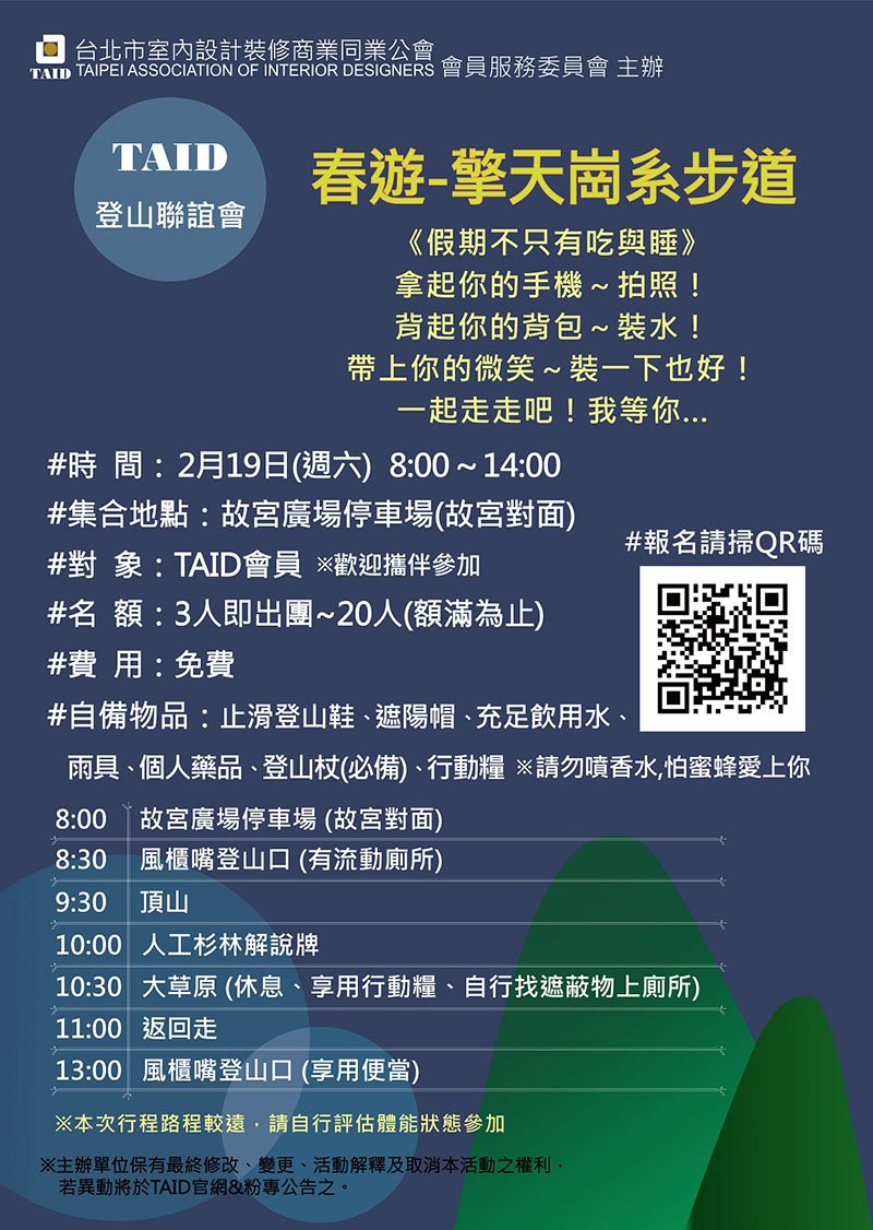 TAID登山聯誼會│2月份活動春遊–擎天崗系步道 春節期間吃胖的、沒動的、想動的,來一趟減脂大作戰~💪 💪 💪 TAID登山聯誼會與您相約❤ 活動時間:2月19日(六)8:00~14:00 TAID會員:免費參加 名額限定:20位 立馬報名: https://forms.gle/aUgqGJ8mZ88eSVv79