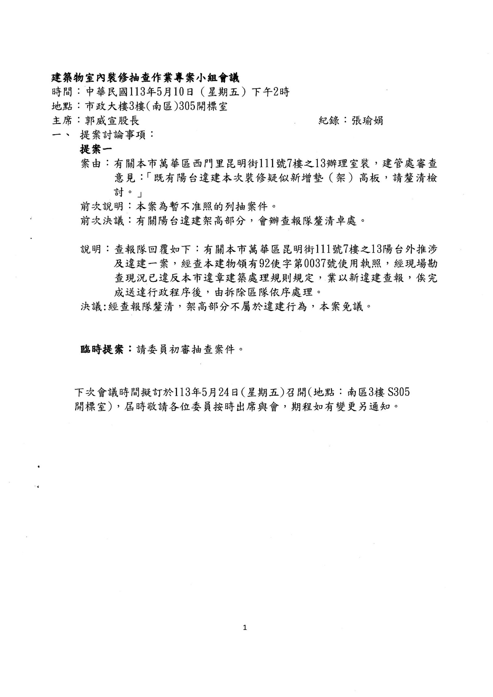 發文單位:臺北市建築管理工程處發文日期:113-5-15發文字號:北市都建使字第1136124515號主旨:檢送本處113年5月10日召開建築物室內裝修抽查作業專案小組會議紀錄1份,請查照。