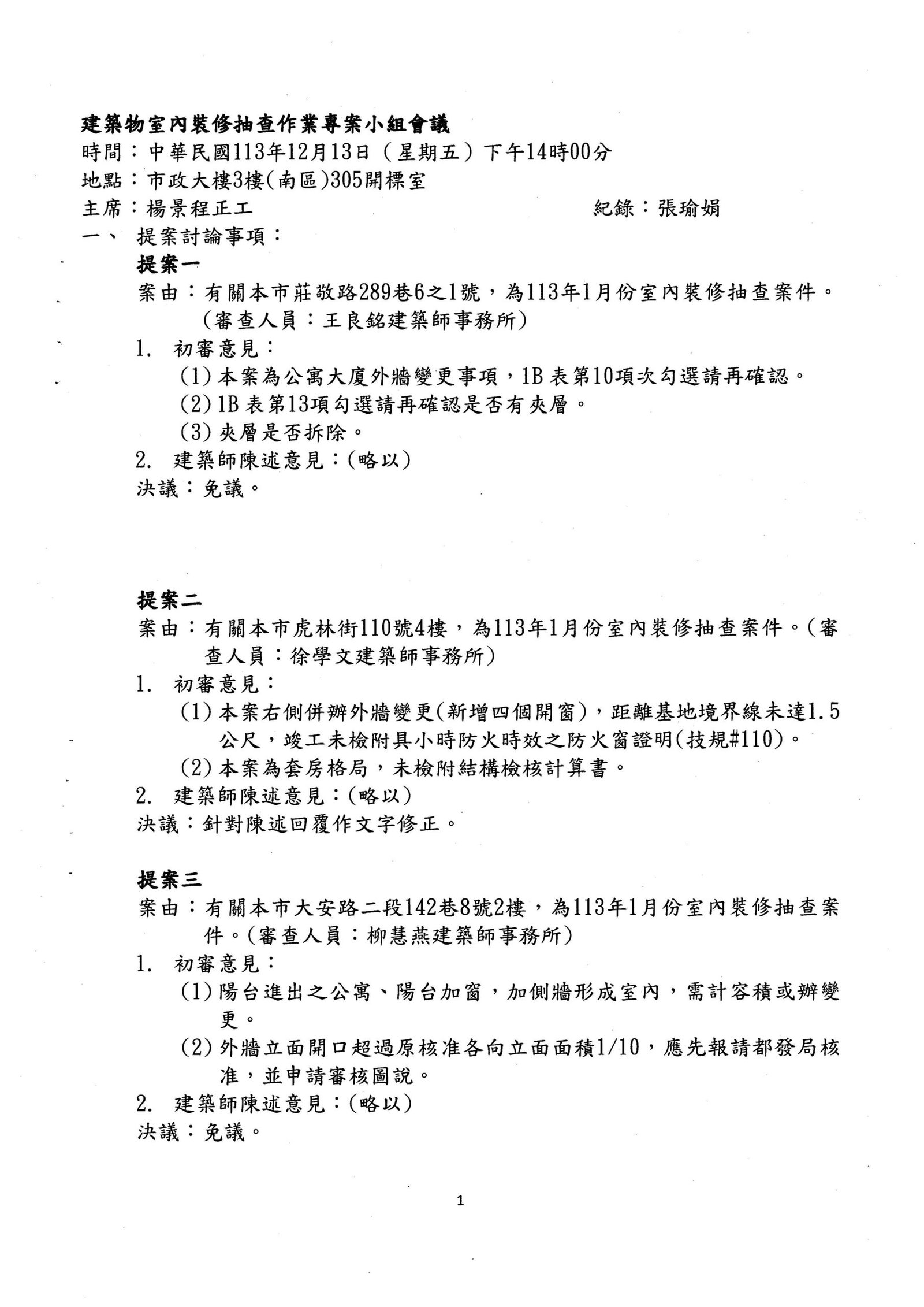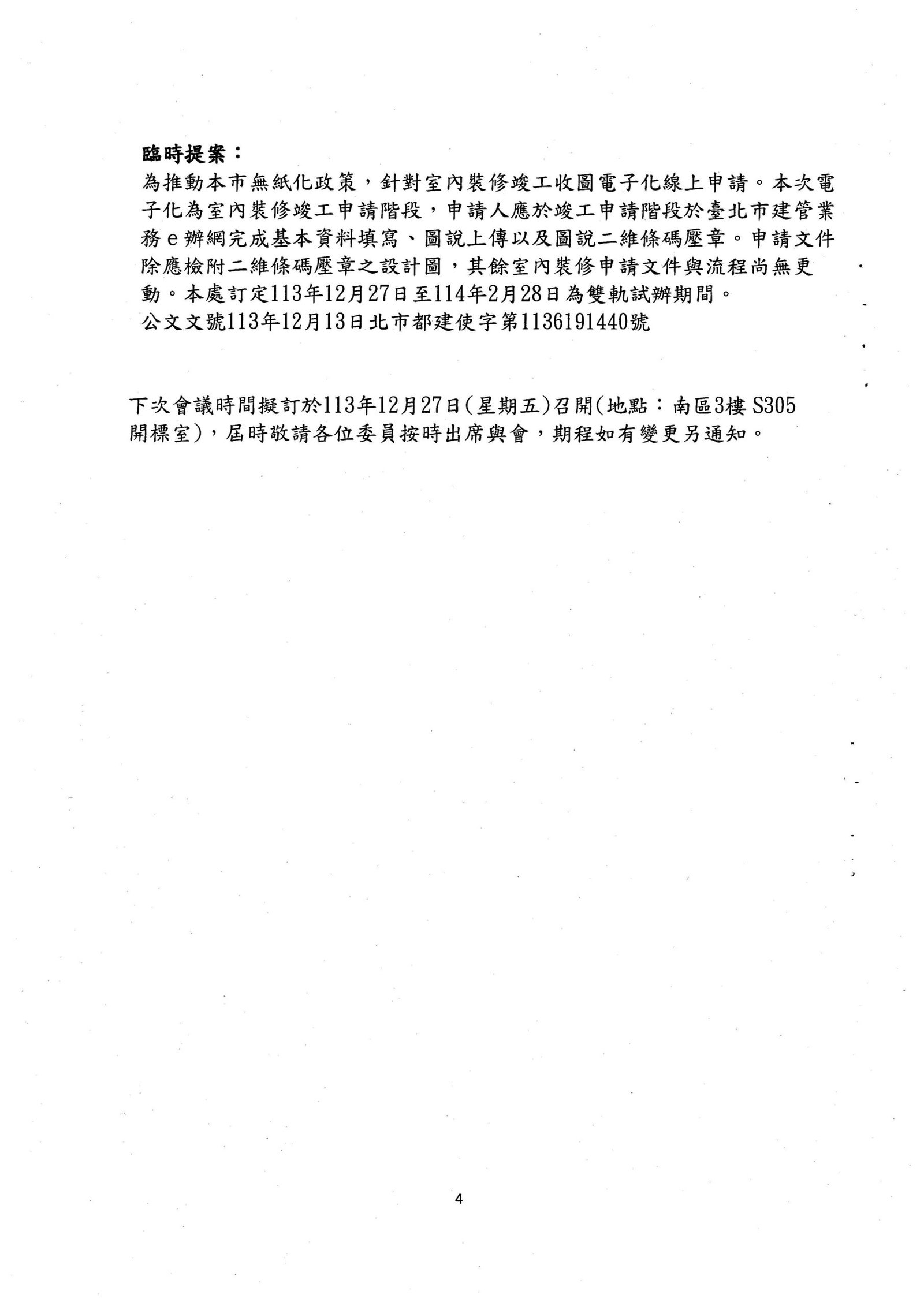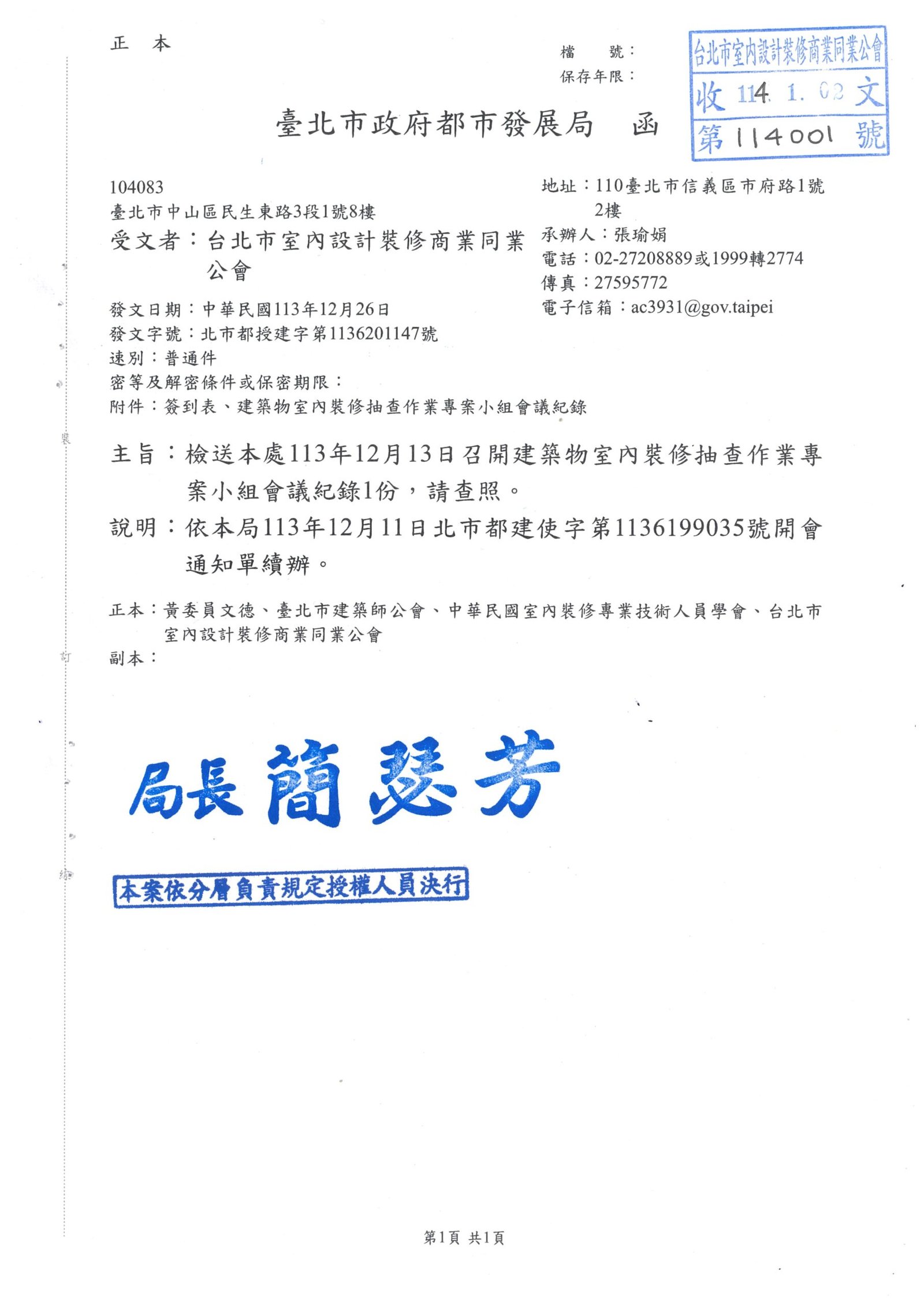 發文單位:臺北市政府都市發展局發文日期:113-12-26發文字號:北市都授建字第1136201147號主旨:檢送本處113年12月13日召開建築物室內裝修抽查作業專案小組會議紀錄1份,請查照。