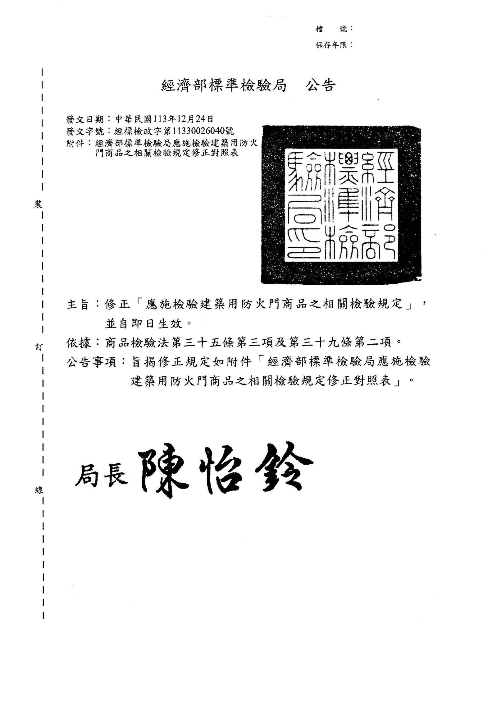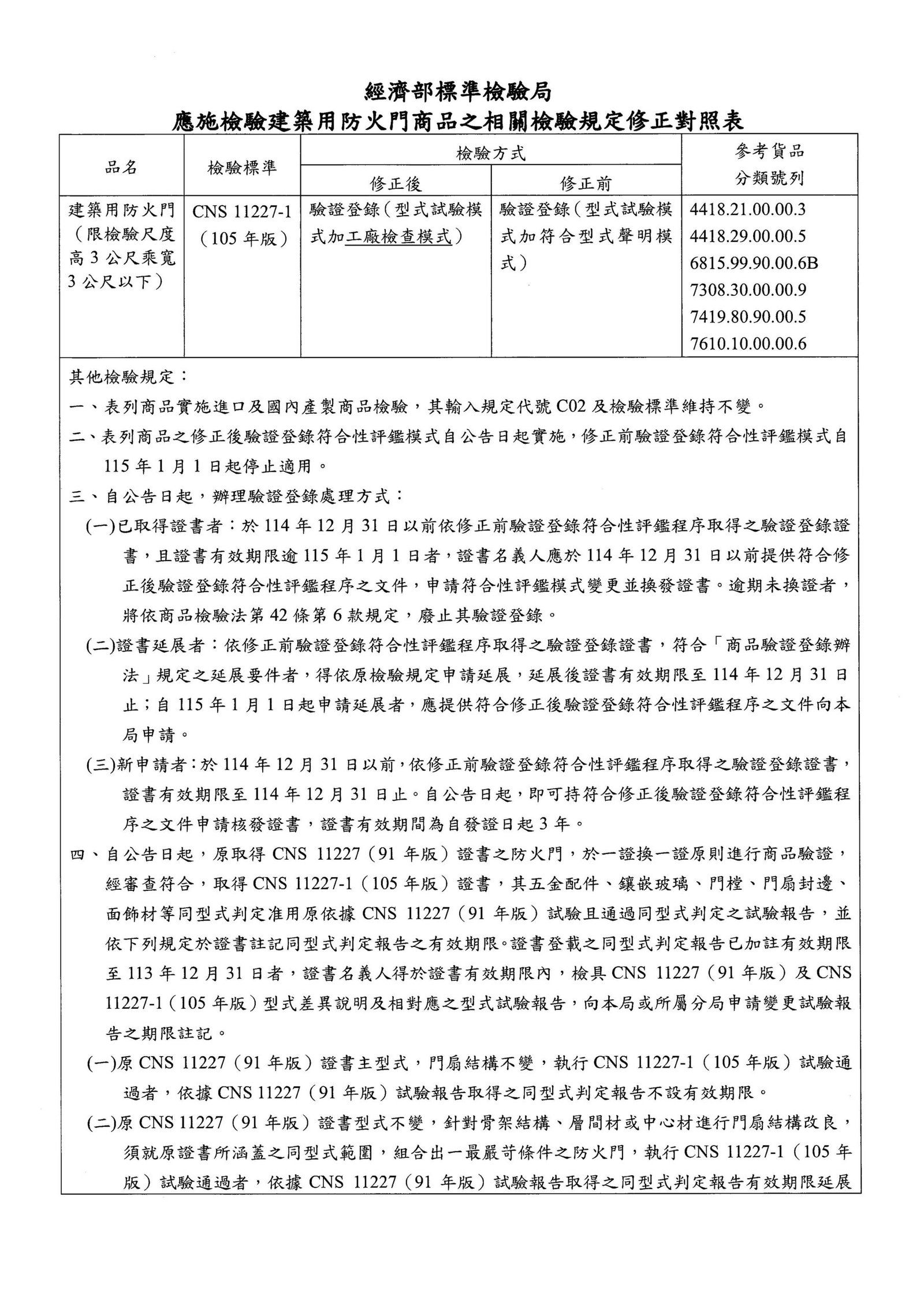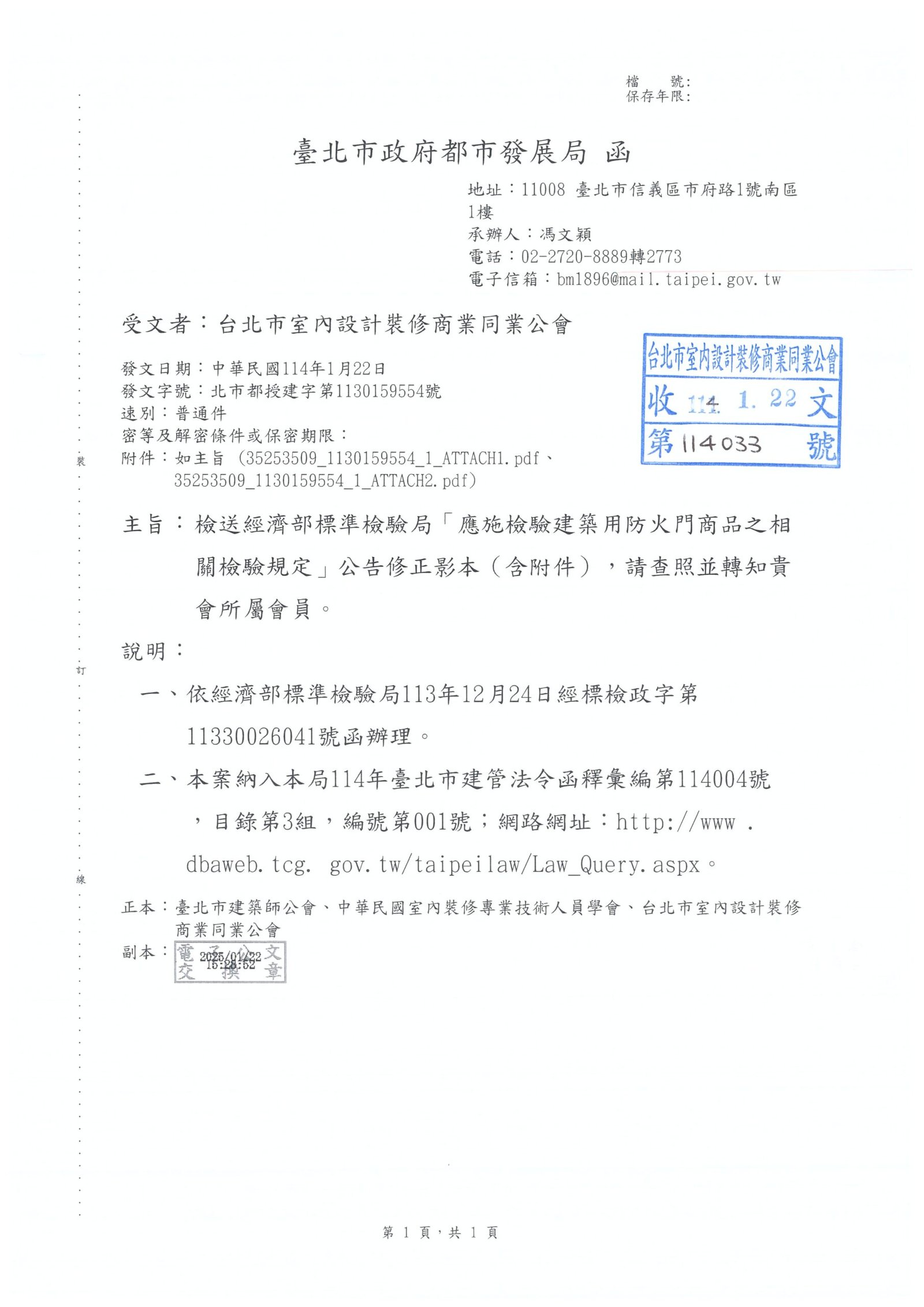 發文單位:臺北市政府都市發展局發文日期:114-01-22發文字號:北市都授建字第1130159554號主旨:檢送經濟部標準檢驗局「應施檢驗建築用防火門商品之相關檢驗規定」公告修正影本(含附件),請查照並轉知貴會所屬會員。