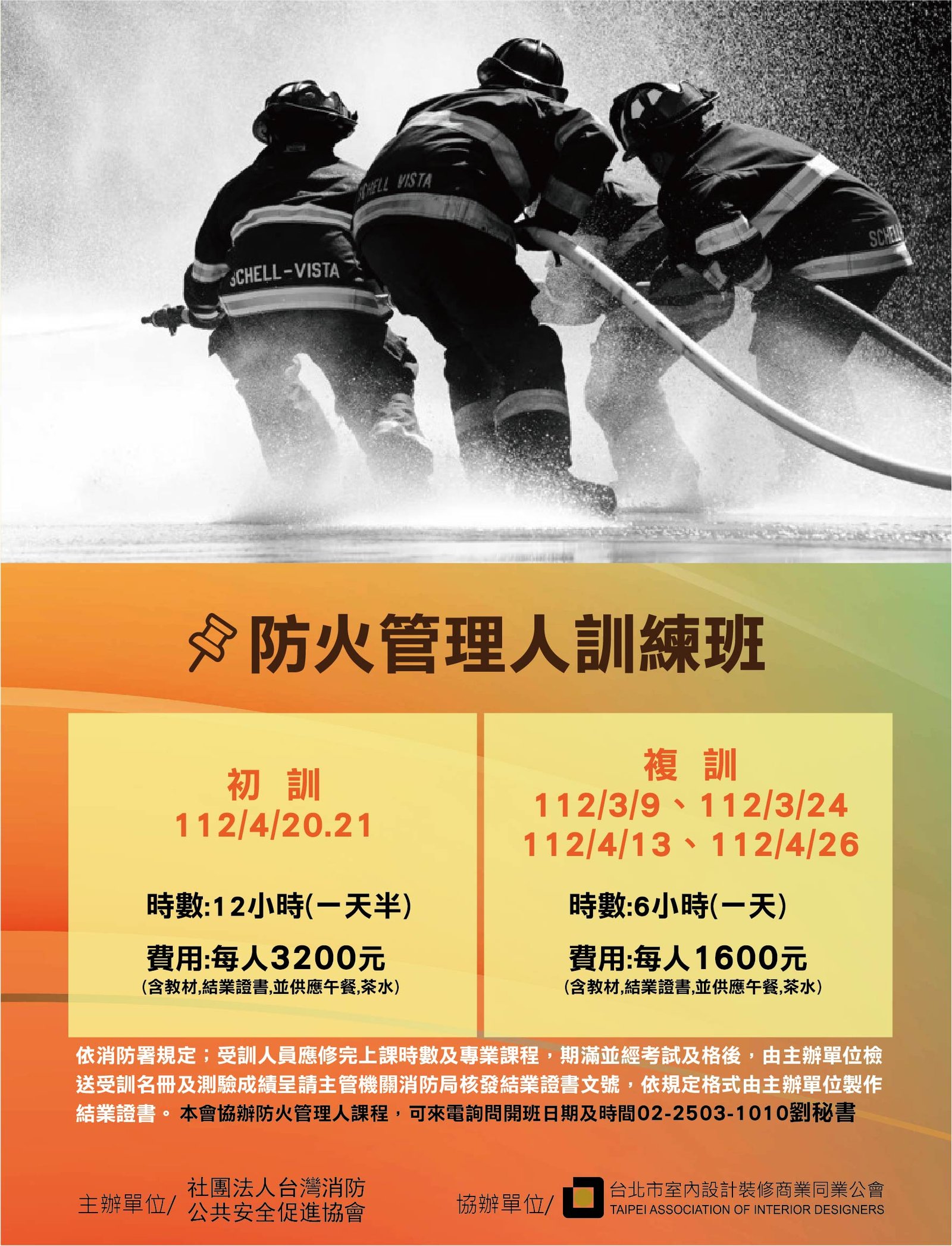 《112年度防火管理人訓練班》 為落實消防法,強化防火安全管理制度。 並提昇事業單位防火管理人消防專業知識、激勵消防專業精神,落實消防防護計劃及其他防火管理事宜,以確保公共安全。 增進消防防護計劃防火知能,建立全民防災共識,保障人民生命與財產之安全。 📌班 別:初訓班 📌日 期:4月20.21日(額滿)/5月18.19日(板橋)/6月15.16日(台北) 📌時 數:12小時(一天半) 📌人 數:每班50人 📌費 用:原價4000元, 本會會員優惠價每人3000元(含教材,結業證書,並供應午餐,茶水) 📌班 別:複訓班 📌日 期:3月9日(額滿)、3月24日(額滿)、4月13日(額滿)、4月26日(額滿)、 5月10日(台北)、5月11日(板橋)、5月26日(板橋)、6月9日(台北)、 6月28日(板橋) 📌時 數:6小時(一天) 📌人 數:每班50人 📌費 用:每人1600元(含教材,結業證書,並供應午餐,茶水) 👉👉下載招生簡章 👉👉下載報名表單 👉報名方式:報名表單填寫完後 傳真02-25092020至本會 👉課程諮詢:請洽秘書處 02-25031010