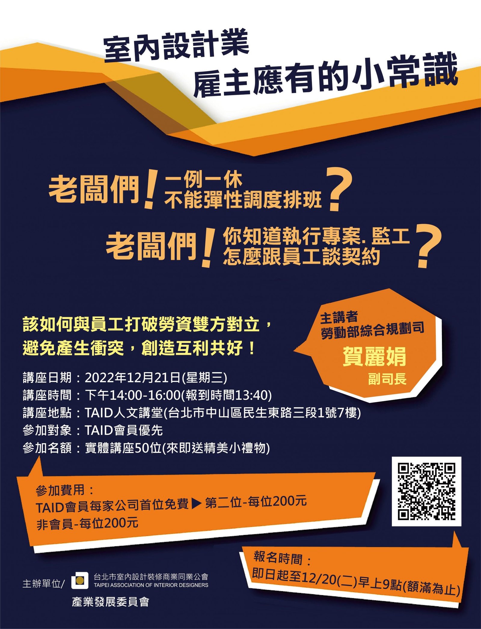 TAID學習日|《室內設計業-雇主應有的小常識》講座 老闆們‼️一例一休 不能彈性調度排班❓ 老闆們‼️執行專案 監工怎麼談契約❓ 試用期如何避免勞資爭議❓正式錄用雇傭契約重點❓ 該如何與員工打破勞資雙方對立,創造互利共好‼️ 歡迎TAID的會員老闆們,將您遇到的問題?🤔想問的問題? 想了解哪一些內容,通通提出來!! 12/21(三)TAID邀請到勞動部綜合規劃司賀副司長,來為大家解答~ 📌講座日期:2022年12月21日(星期三) 📌講座時間:下午14:00-16:00(報到時間13:40) 📌講座地點:TAID人文講堂(台北市中山區民生東路三段1號7樓) ✅參加對象:TAID會員優先 ✅參加費用:TAID會員每家公司首位免費,第二位-每位200元,非會員-每位200元 ✅參加名額:實體講座50位(來即送精美小禮物) ✅報名時間:即日起至12/20(二)早上9點(額滿為止) 點我報名🔗 提問表單🔗