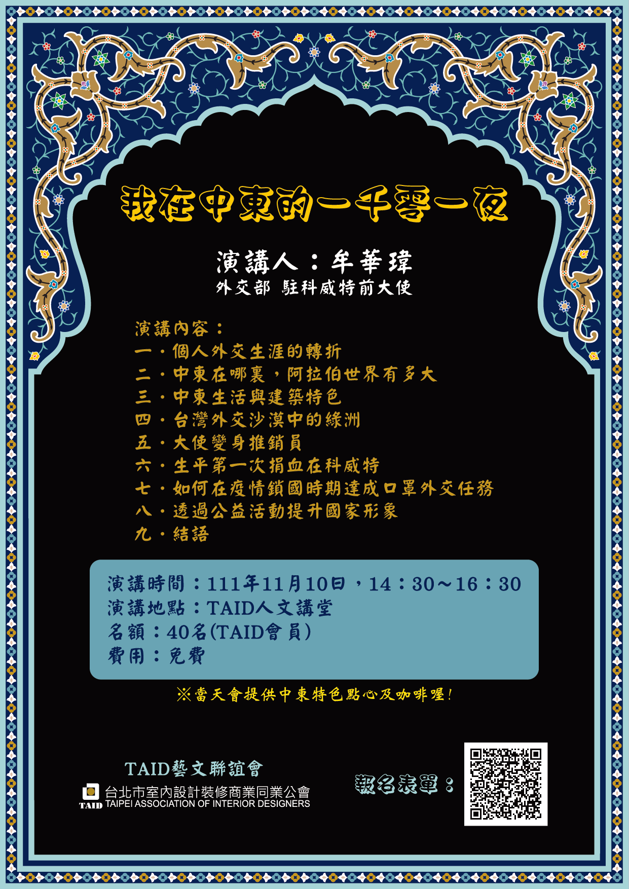 演講當天會提供中東特色點心及咖啡,限量40名,趕緊火速報名!🔥🔥🔥