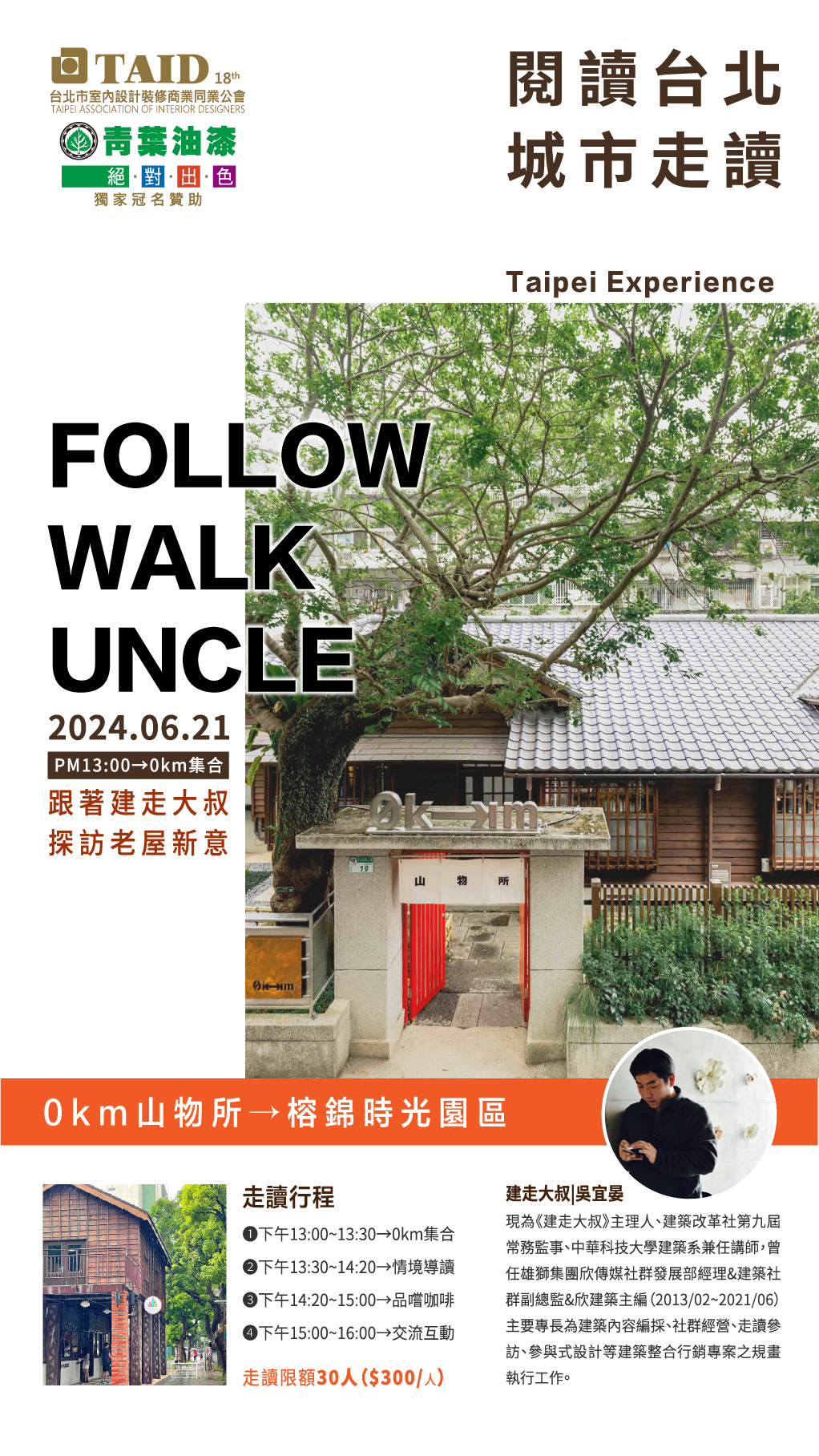 FOLLOW WALK UNCLE 跟著建走大叔探訪 台北新秘境!開箱0km山物所:百坪日式老屋與森林 「點亮大安區,成為幸福的場所」的榕錦時光園區 【建走大叔 | 吳宜晏】 現為《建走大叔》主理人、建築改革社第九屆常務監事、中華科技大學建築系兼任講師, 曾經擔任雄獅集團欣傳媒社群發展部經理&建築社群副總監&欣建築主編(2013/02~2021/06)。主要專長為建築內容編採、社群經營、走讀參訪、 參與式設計等建築整合行銷專案之規畫執行工作。 📌活動時間:06/21(五)13:00~16:00(報到集合地點→0km) 📌活動地點:台北市大安區金山南路二段203巷21號(0KM山物所) 📌活動費用:300元/人 📌活動名額:限額30人 感謝《青葉油漆》獨家冠名贊助 本次閱讀台北城市走讀活動 敢……………………………………………………………………. ………👉報名參加活動👈