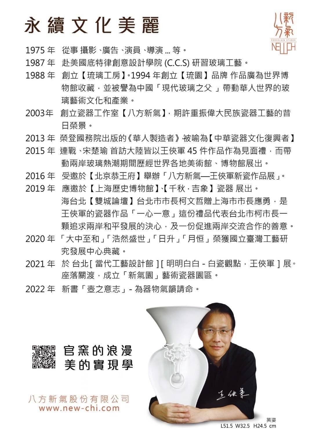 《TAID攝影聯誼會》7月份活動~王俠軍八方新氣參訪&下午茶☕ 官窯的浪漫・美學的實現🌟 帶著浪漫的情懷,不忘初心,永抱追求殿堂極致的激情💞 不僅最好 ·更要唯一,以精湛工藝實現瓷器當代的新風釆👍 為再創瓷器的歷史高度和突破造型的束縛, 2003年不顧瓷土高溫收縮龜裂和軟化變形的天險, 由王俠軍領軍,從台北啟航,踏出歷史的第一步, 以「不僅最好 更要唯一」的精神,與時俱進, 希望從美學的角度、時尚的風情、生活的歡喜,展開瓷器劃時代的探索紀元。 ※特別邀請到 王俠軍老師 來為我們做白瓷藝術園區簡報及理念分享 📸辛建民會長(0932059253)敬邀 📍活動日期 | 7月12日(三)下午14:30報到,15:00~17:00 📍活動地點 | 北市北投區中央路四段515巷16號…….. ……….. 📍活動名額 | 20位,額滿即止…………. ……………………………… 👉手刀報名🔗