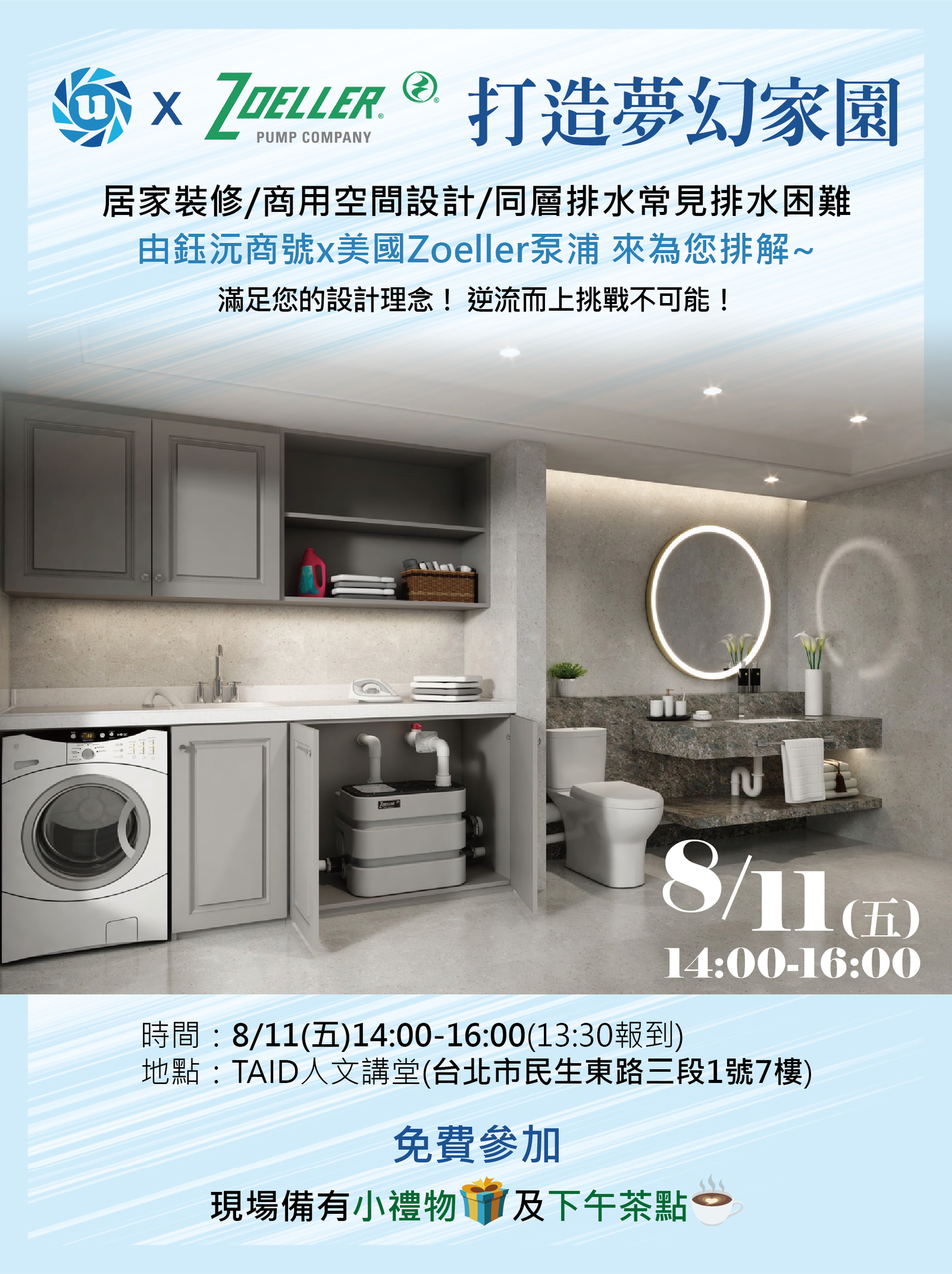 滿足您的設計理念‼️ 逆流而上挑戰不可能💪 居家裝修/商用空間設計/同層排水常見排水困難🧐 由鈺沅商號 x 美國Zoeller泵浦來為您排解~ 📌時間:8/11(五)14:00-16:00(13:30開放報到)……………………. 📌地點:TAID人文講堂(台北市中山區民生東路三段1號7樓) ✨免費入場✨ 🔗需填寫報名表 ★主辦單位:鈺沅商號…… ★現場備有小禮物🎁及下午茶點☕