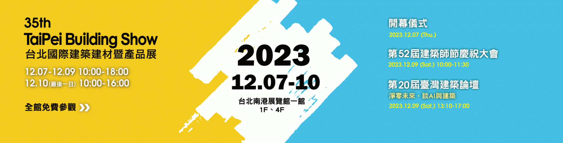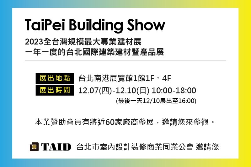 「第35屆台北國際建築建材暨產品展」即將在12/7(四)~12/10(日) 於南港展覽館一館1樓展場、四樓展場盛大舉行🎉 TAID贊助會員有60多家參展!!歡迎各位設計師共襄盛舉、大力支持!💪 💖TAID廠商參展名單💖 Clean Up、Lagoon、UPLUS、YALE、一澤、上洋產業、世磊、金寶櫥、 五陽暖暖、交泰興、光華牌、冠軍、劉三五金、北二高、金展、金永貿、 台灣國際門框、日立、松下、阿克蘇諾貝爾、台達電子、加伊(安易居)、 大金空調、天恆國際、太格、尚德、展晟、山衍、帝航日、寶元智造、 慶泰樹脂、振洲、昇元窯業、明星照明、昶曜、東湧、松華、青葉油漆、 格威、梅花鋁業、歐德、永聖、永記、煌益精密工業、王泉記、麟鴻、文文科技、 環球水泥、生原家電、睿特環工、禾邁、綠夏、羅特麗、泰綺(北大建材)、 翁來水之藝、翔特、興立富、艾立思、藍天、觀境設計、通越、卓霖。 主辦單位|中華民國全國建築師公會、大展國際股份有限公司 👉建材展官網👈