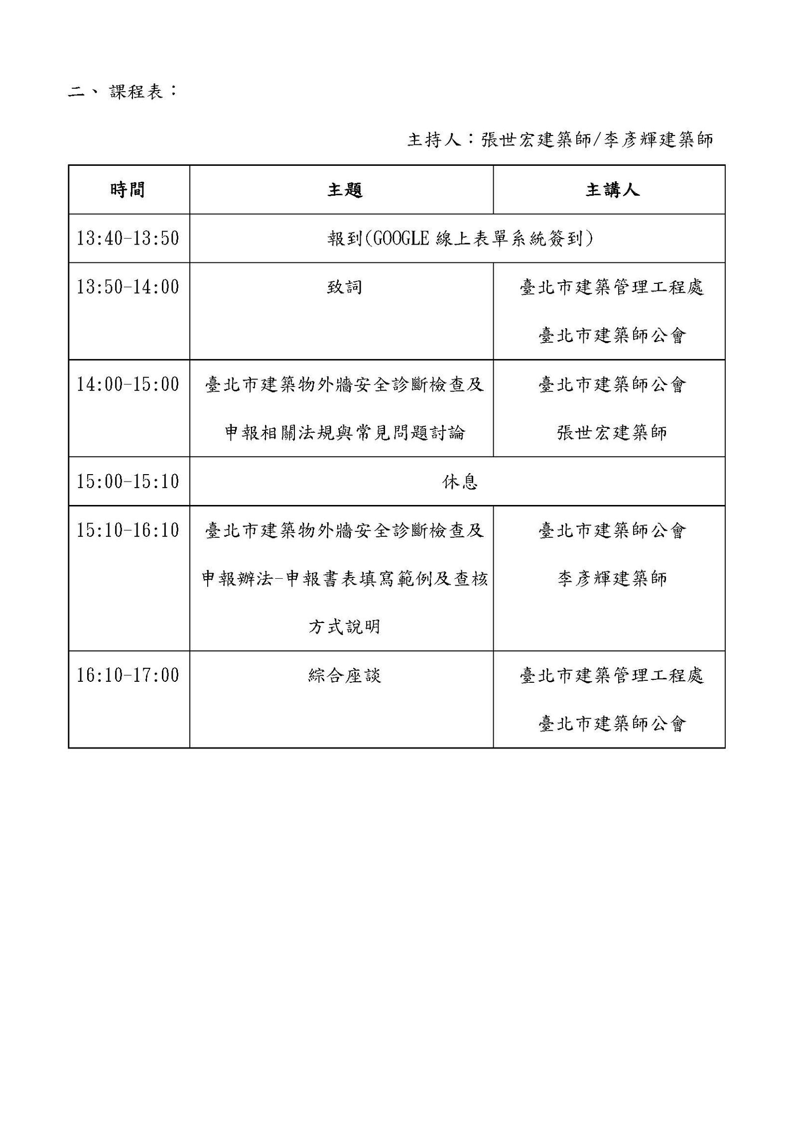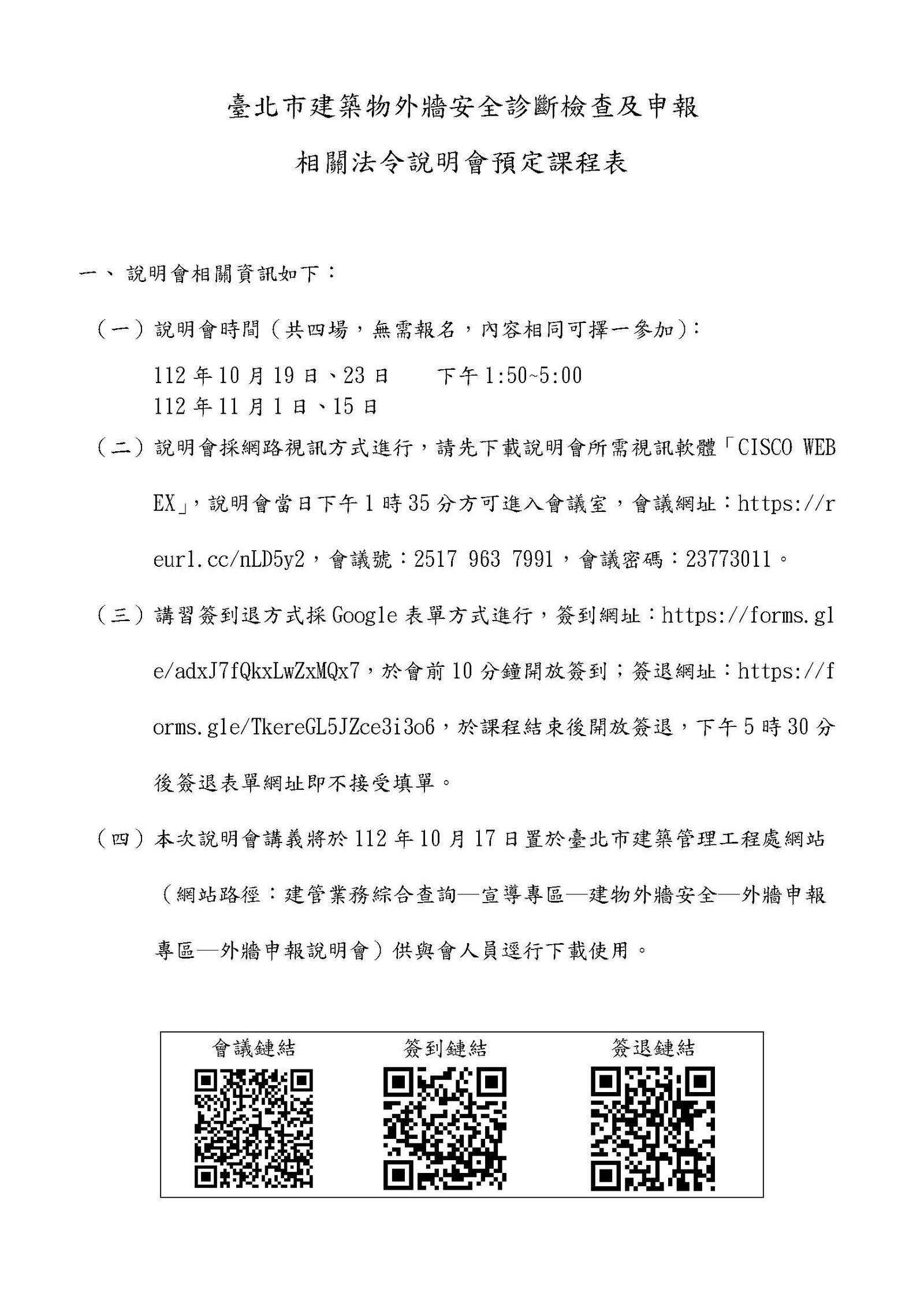 臺北市「建築物外牆安全」診斷檢查及申報相關法令說明會 臺北市建築管理工程處為維護市民公共安全,避免建築物外牆飾面剝落情事,遂制定臺北市建築物外牆安全診斷檢查及申報制度,並公告11層樓以上商業區且核發使用執照超算滿30年以上之建築物應於115年12月31日前辦理申報,為推動建築物外牆安全診斷檢查及申報制度,宣導相關法令內容,爰辦理本次說明會,敬請會員們踴躍參加。 「臺北市建築物外牆安全診斷檢查及申報相關法令說明會」共4場 ✅採「網路視訊」方式進行「無需報名」 ✅四場說明會內容相同民眾「擇一參加」 📌日期:10/19(四)、10/23(一)、11/1(三)、11/15(三) 📌時間:13:50~17:00說明會當日13:35即可進入會議室 📌會議網址:https://reurl.cc/nLD5y2 📌會議號:25179637991 📌會議密碼:23773011 👉說明會資訊連結 👉下載說明會講義