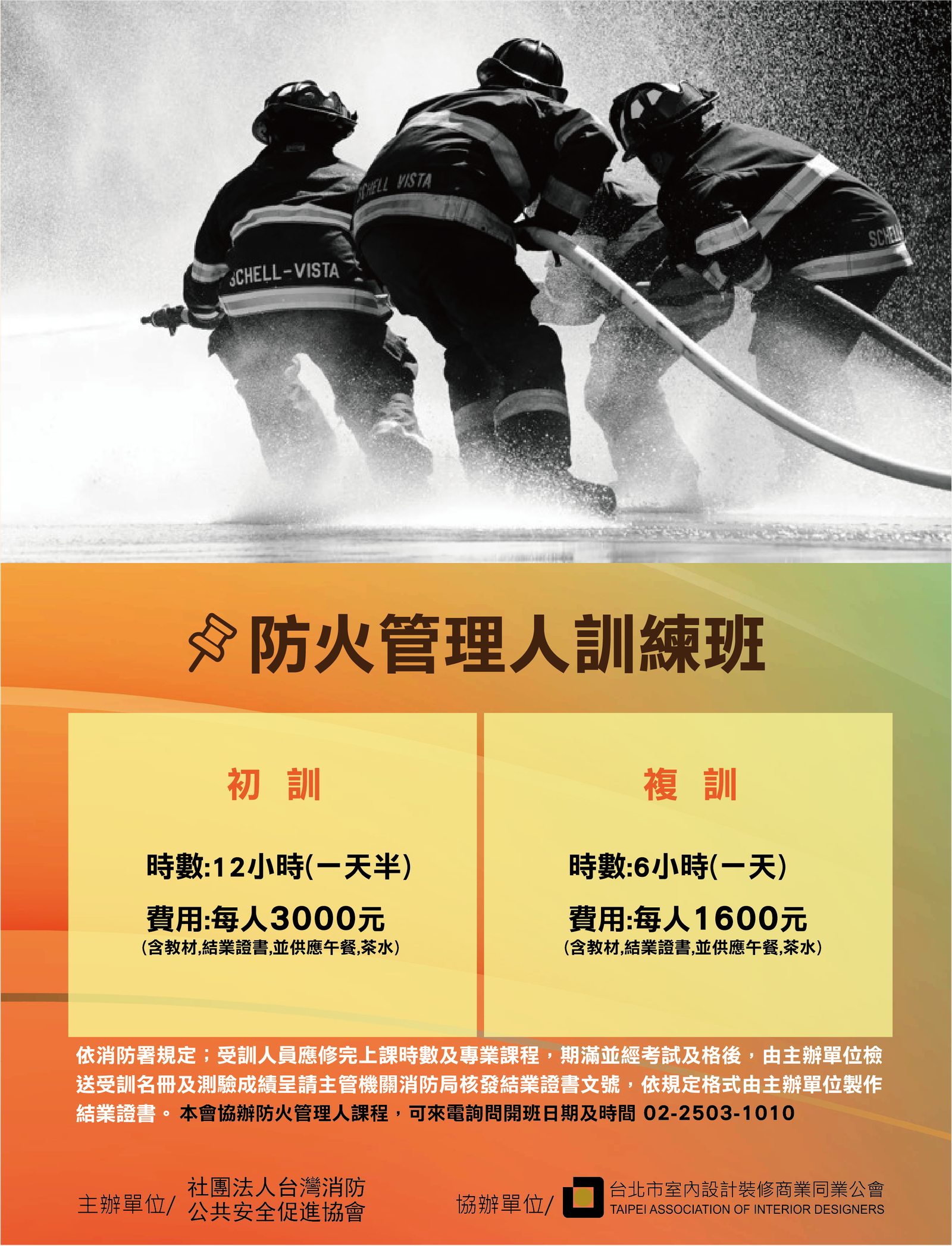 《114年度防火管理人訓練班》 為落實消防法,強化防火安全管理制度。 並提昇事業單位防火管理人消防專業知識、激勵消防專業精神, 落實消防防護計劃及其他防火管理事宜,以確保公共安全。 增進消防防護計劃防火知能,建立全民防災共識,保障人民生命與財產之安全。 📌班 別:初訓班 📌日 期:元月9、10日台北初訓/2月20、21日板橋初訓/3月20、21日台北初訓/4月24、25日板橋初訓/5月21、22日台北初訓/6月19、20日板橋初訓 📌時 數:12小時(一天半) 📌人 數:每班50人 📌費 用:原價4000元, 本會會員優惠價每人3000元(含教材,結業證書,並供應午餐,茶水) 📌班 別:複訓班 📌日 期:元月15日台北複訓/元月17日板橋複訓/2月13日台北複訓/2月26板橋複訓/3月28日板橋複訓/4月17日台北複訓/4月30日板橋複訓/5月14日台北複訓/5月23日板橋複訓/6月12日台北複訓/6月25日板橋複訓 📌時 數:6小時(一天) 📌人 數:每班50人 📌費 用:每人1600元(含教材,結業證書,並供應午餐,茶水) 👉👉下載招生簡章 👉👉下載報名表單 👉報名方式:報名表單填寫完後 傳真02-25092020至本會 👉課程諮詢:請洽秘書處 02-25031010 👉主辦單位:台灣消防公共安全促進協會 👉協辦單位:台北市室內設計裝修商業同業公會 ※消防署新規定,消防管理人證書應在有效期間內複訓,證書逾期未複訓者, 應重新初訓,115年1月1日正式施行。(114年開始宣導緩衝一年)