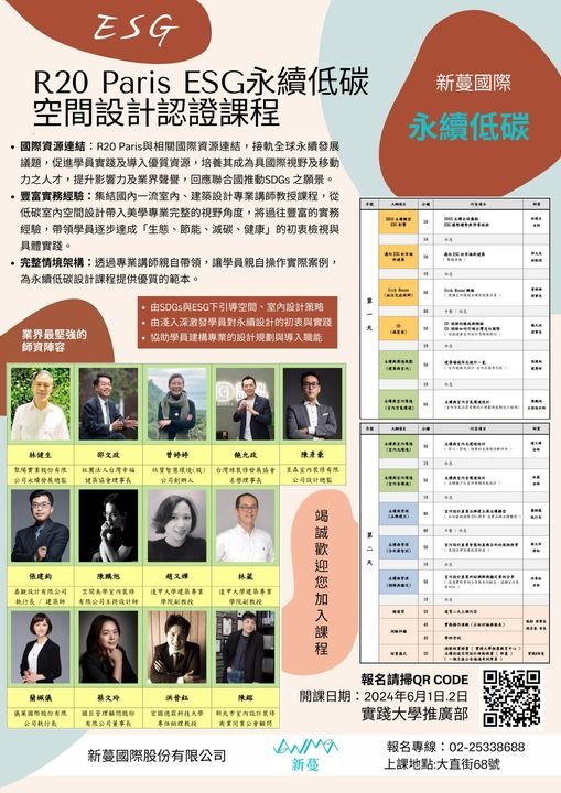 📢由實踐大學推廣教育部舉辦 永續低碳空間設計認證課程 課程特色:國際資源連結:R20 Paris與相關國際資源連結,接軌全球永續發展議題, 促進學員實踐及導入優質資源,培養其成為具國際視野及移動力之人才, 提升影響力及業界聲譽,回應聯合國推動SDGs 之願景。 📌開課日期:2024-06-01至2024-06-02 💡報名連結💡