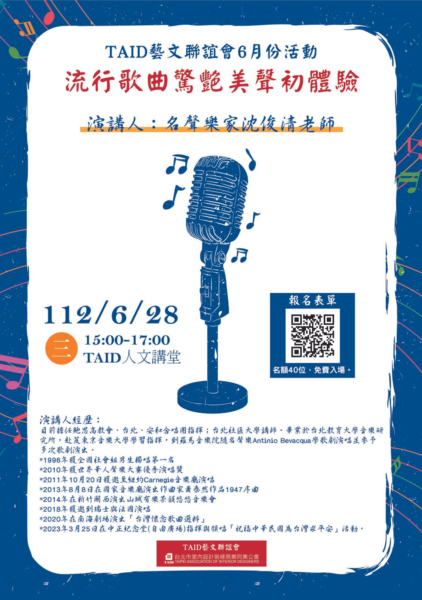 《TAID藝文聯誼會》6月份活動~流行歌曲驚艷美聲初體驗🎶 🎤演講人:名聲樂家沈俊清老師(鮑思高教會、台北‧安和合唱團指揮;台北社區大學講師) 熱情邀請會員參加,杜國源會長(0937042931)敬邀💖💖 🎵日期:112/6/28(三) 15:00-17:00 🎵地址:TAID人文講堂…………………….. 🎵名額:40位,費用免費(free)…….. 🎵手刀報名👉https://forms.gle/z6LFtegc3ybgDwVr8
